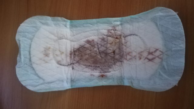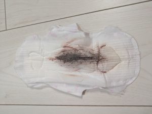 すると、パンツの裏地には、経血がしみ込んで黒く変色したナプキンが装着されており、僕の目にその光景が飛び込んできました。
